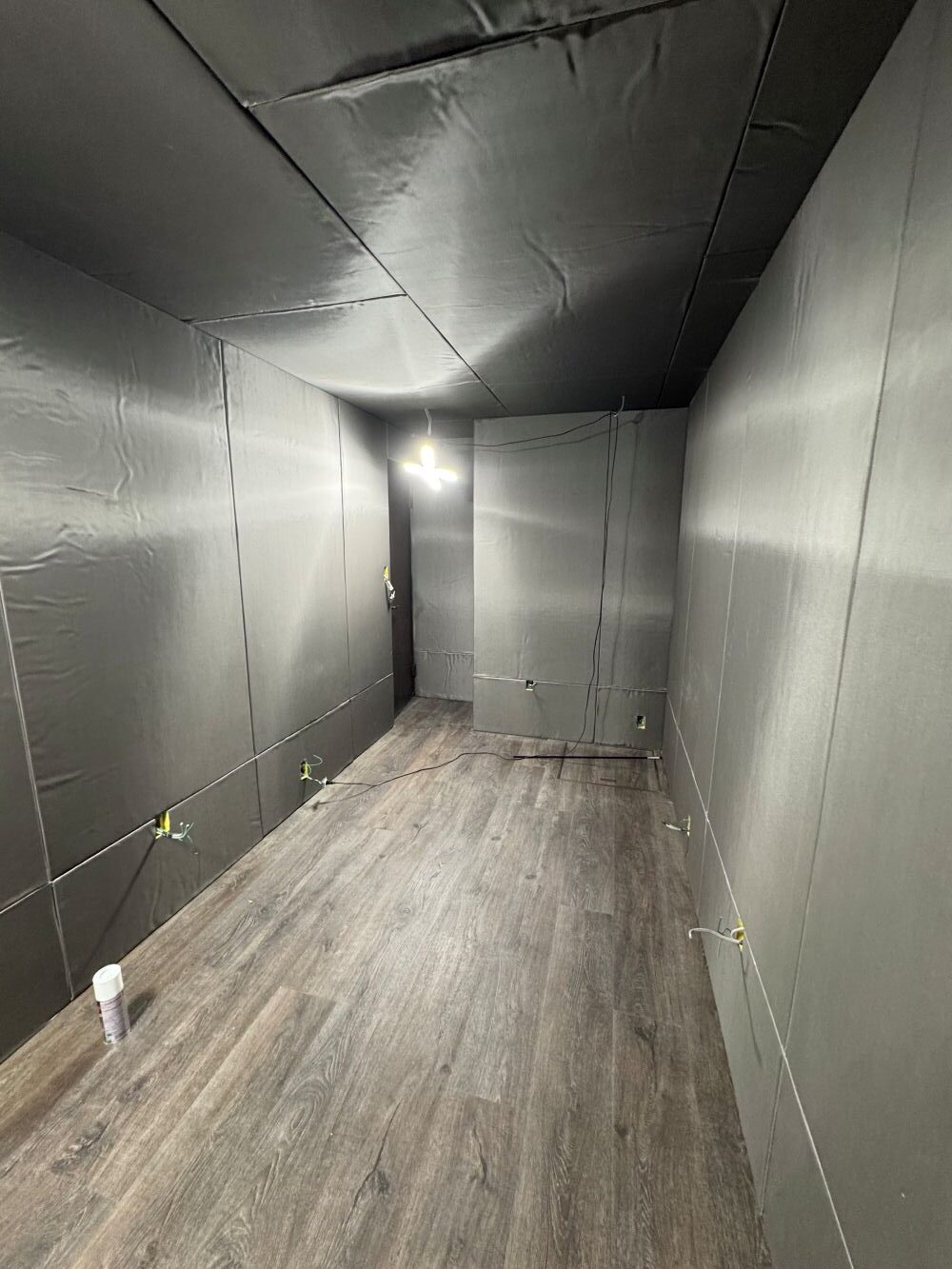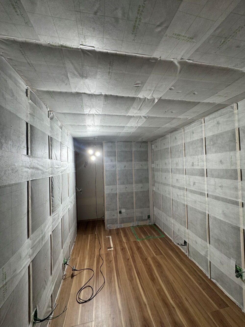 もともとは普通の洋室だったお部屋。工事では、壁・天井・床に遮音シートと吸音材を丁寧に重ねていきます。写真はその途中の様子です。一見シンプルに見えますが、音を「通さない・吸う・響かせすぎない」の3つを組み合わせるのがポイントなんですよ!